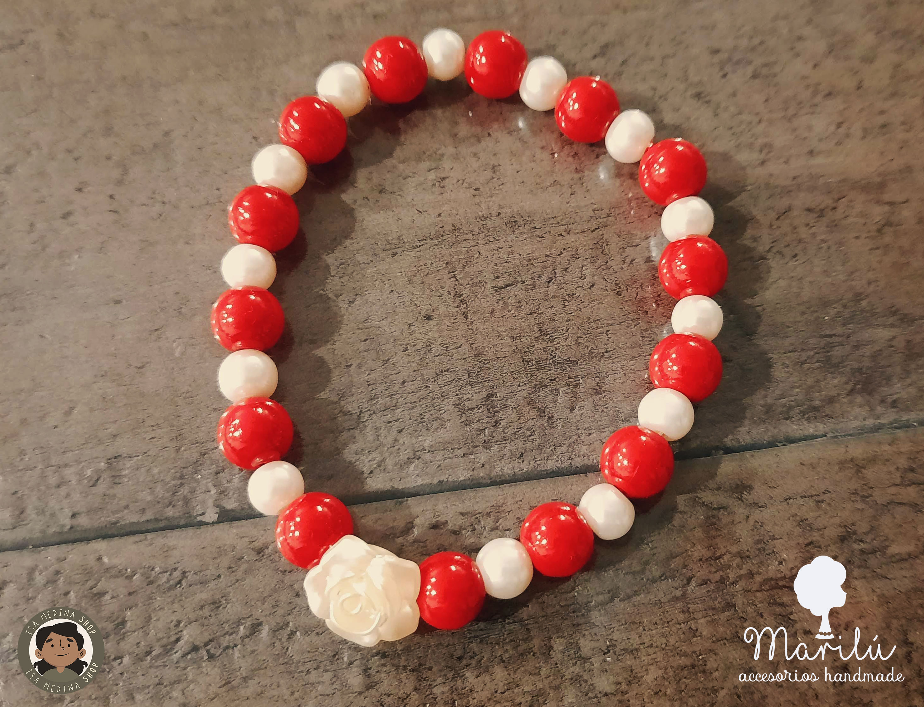 Inspirada en el estilo clásico y coqueto del rockabilly retro, esta pulsera combina perlitas acrílicas en blanco y rojo con una delicada rosa blanca al centro, evocando esos icónicos looks de lunares y labios rojos. Perfecta para añadir un toque vintage y femenino a cualquier outfit.