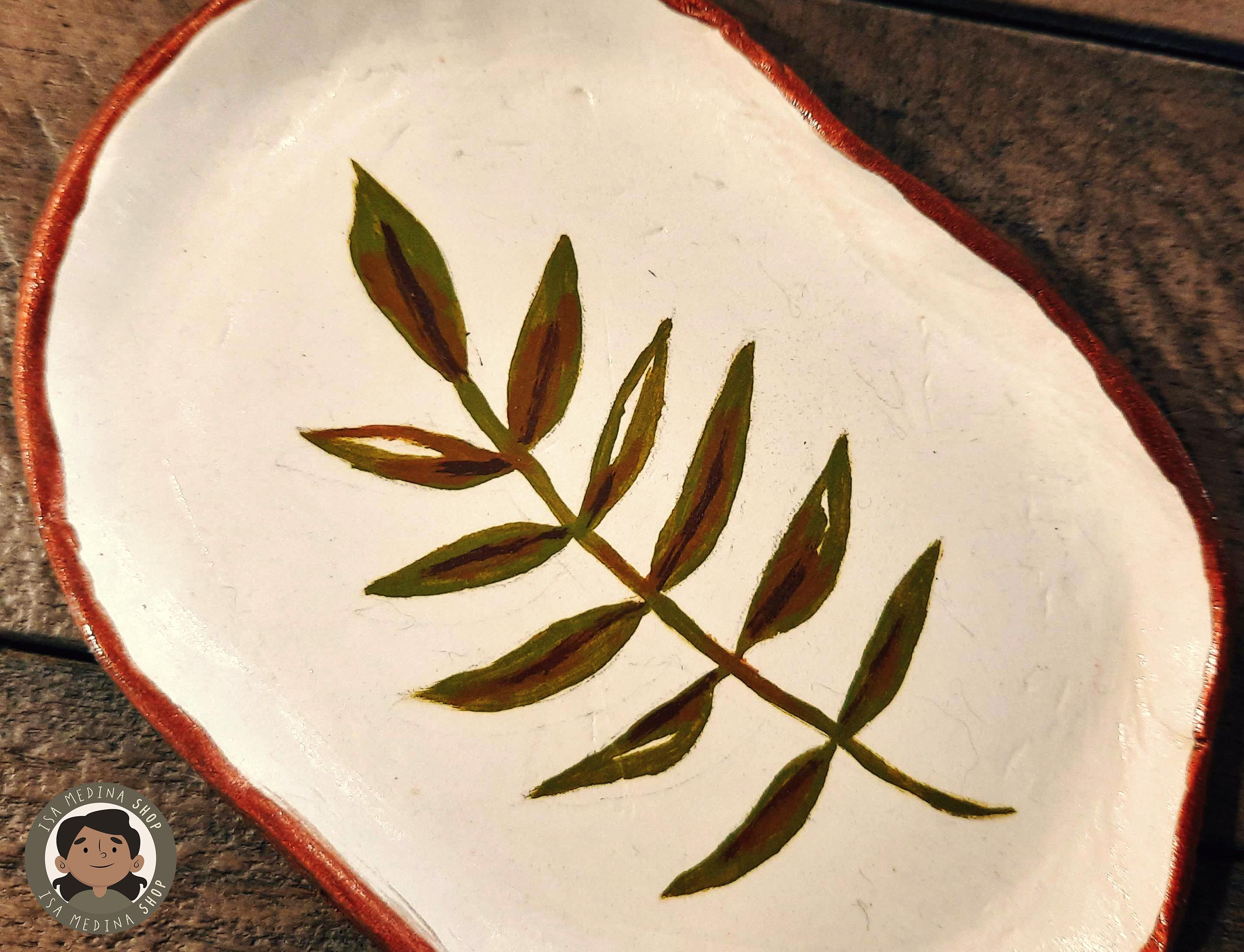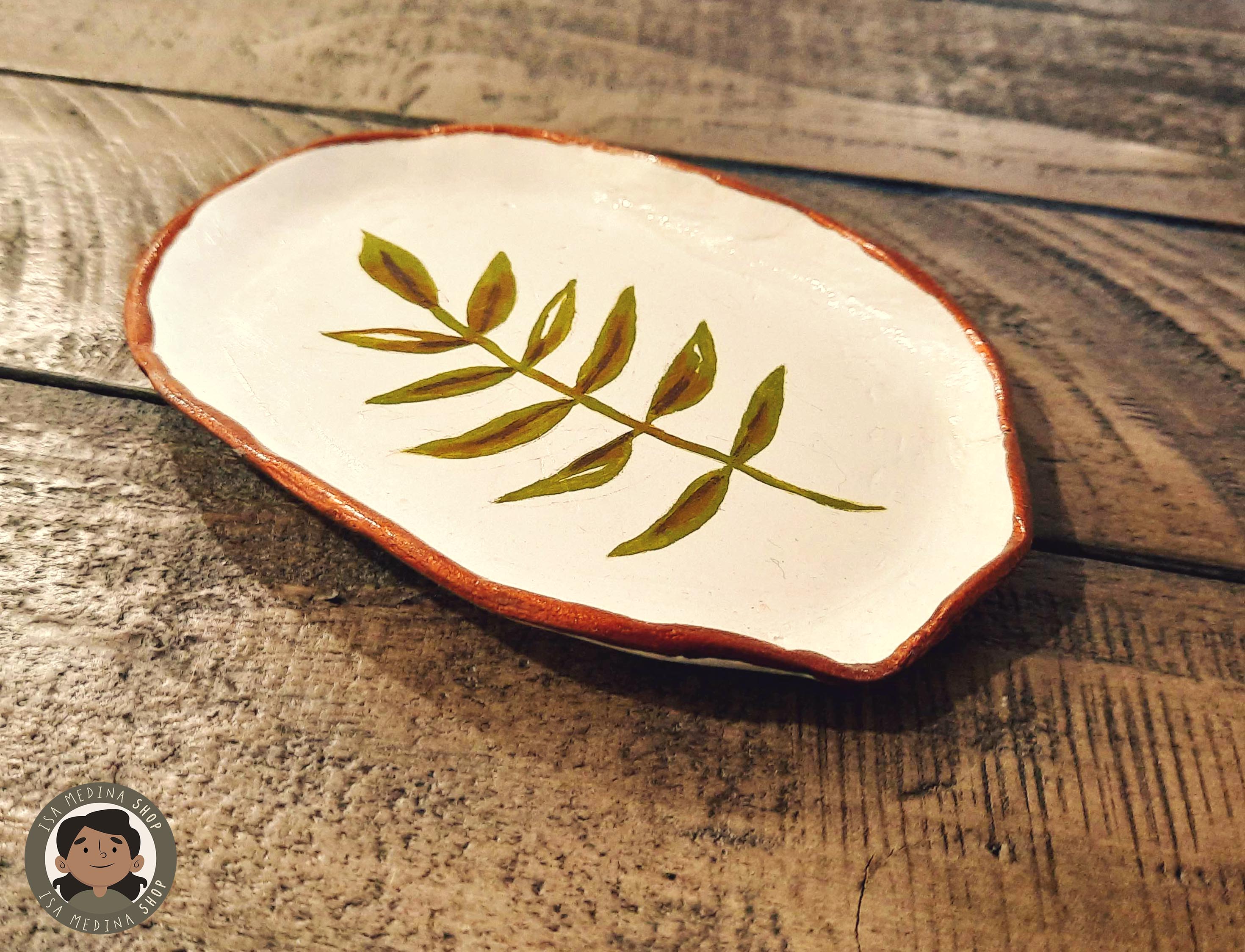 Este pequeño alajero está hecho completamente a mano con arcilla para moldear y pintado con pinceladas cuidadosas usando pintura acrílica. Su forma orgánica —no perfectamente pareja— le da un carácter único y encantador. En el centro lleva una delicada ilustración de una plantita, también pintada a mano.