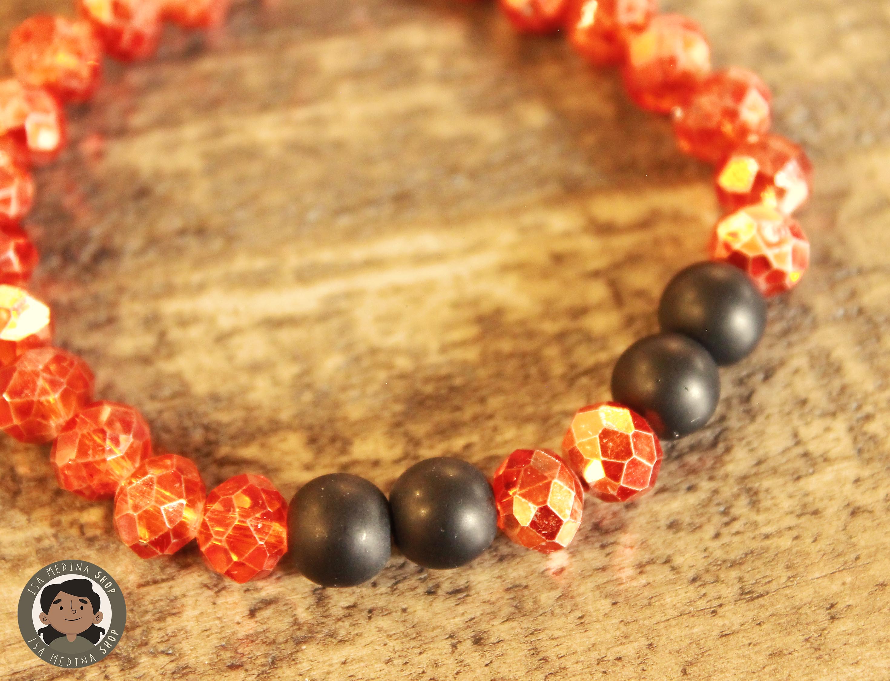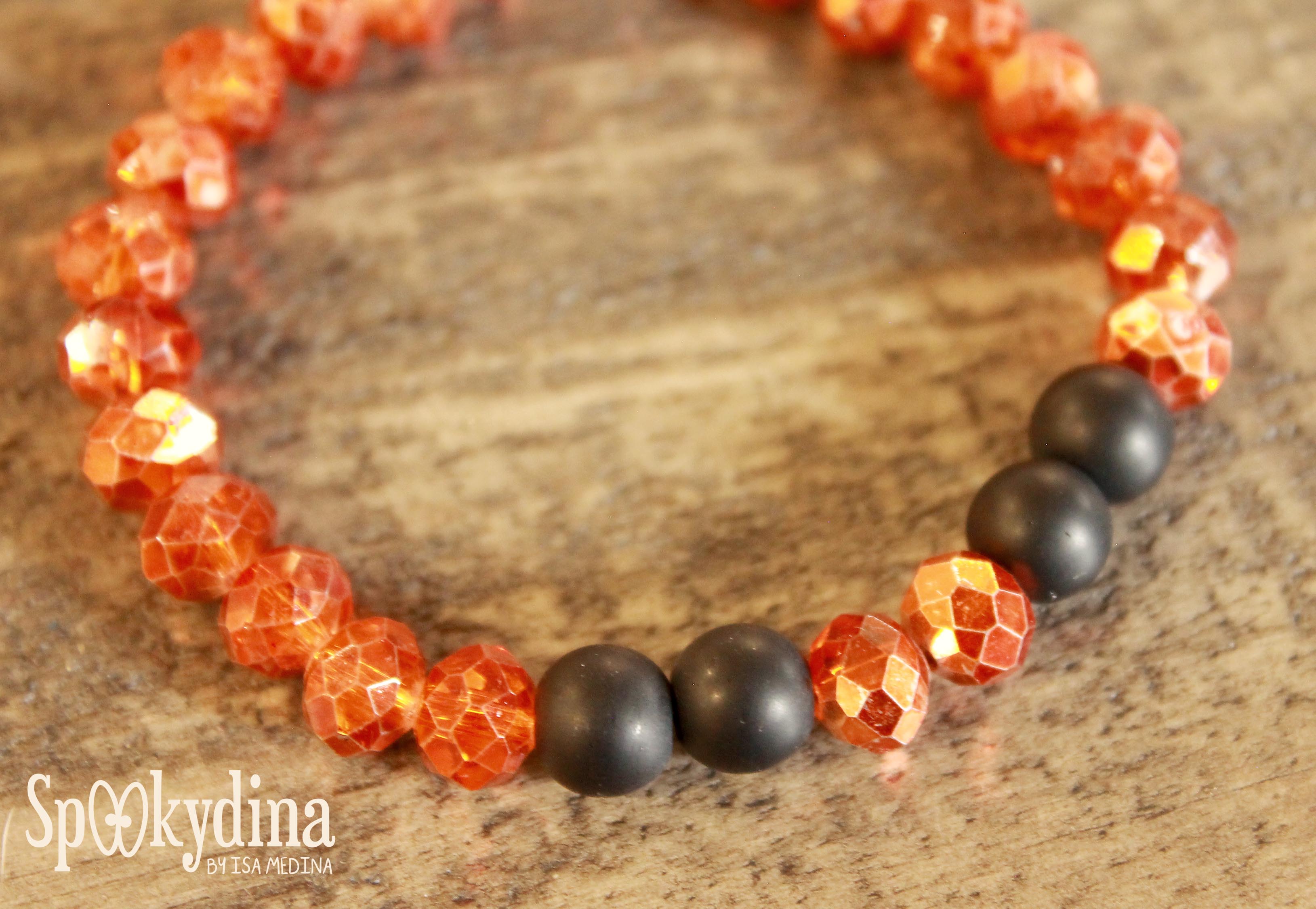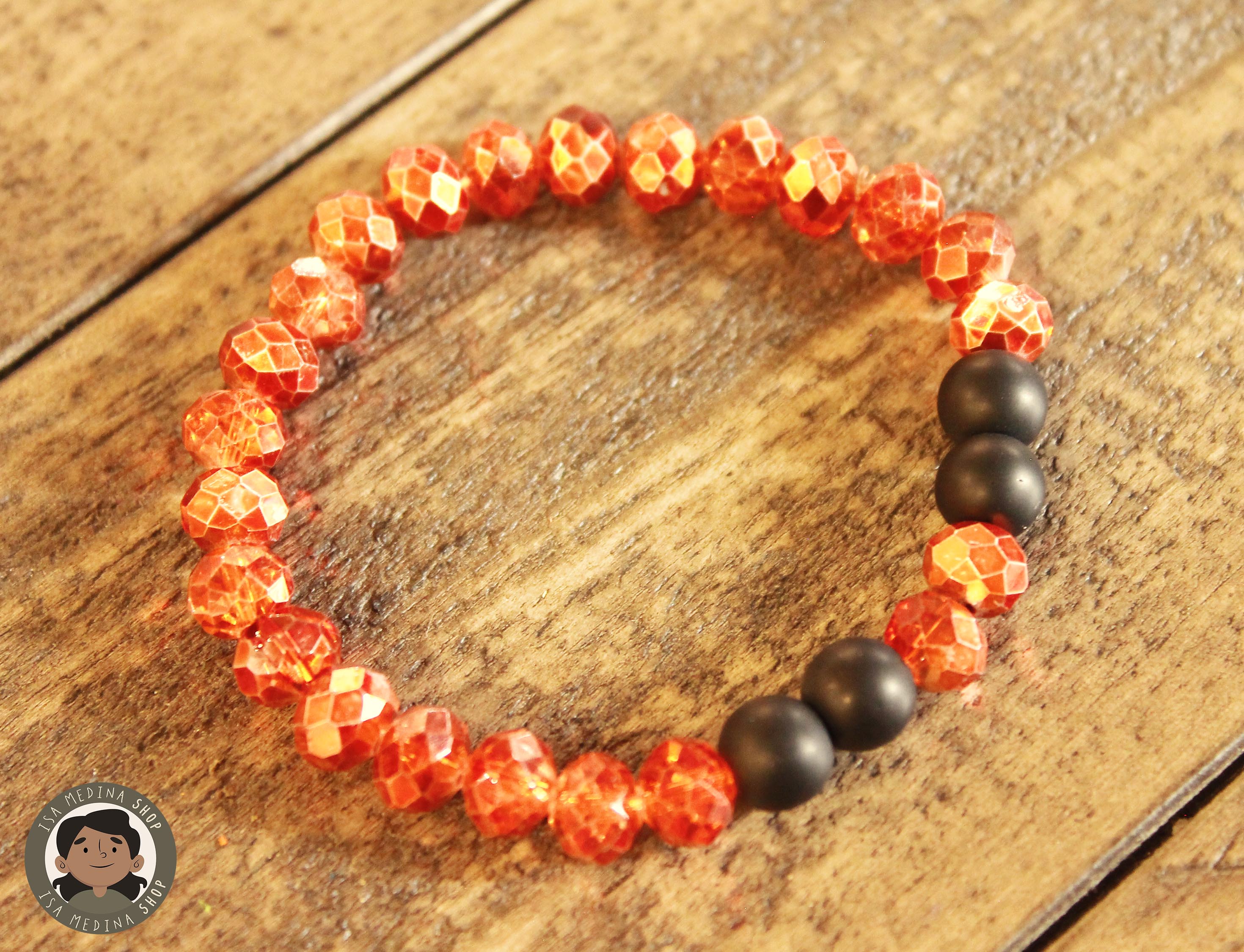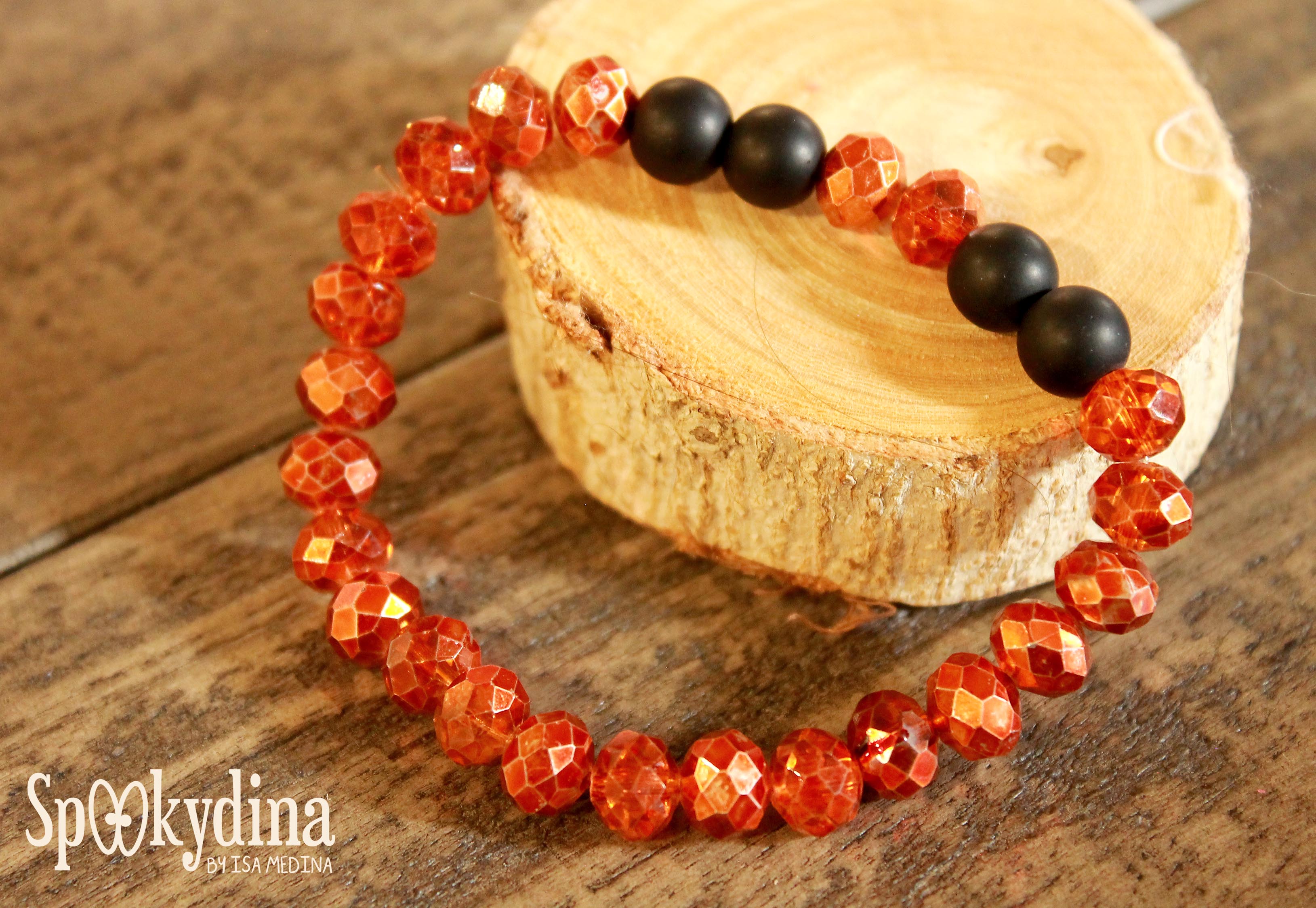 Una bonita pulsera con cristal en tono naranja, como calabaza y perlitas onix mate