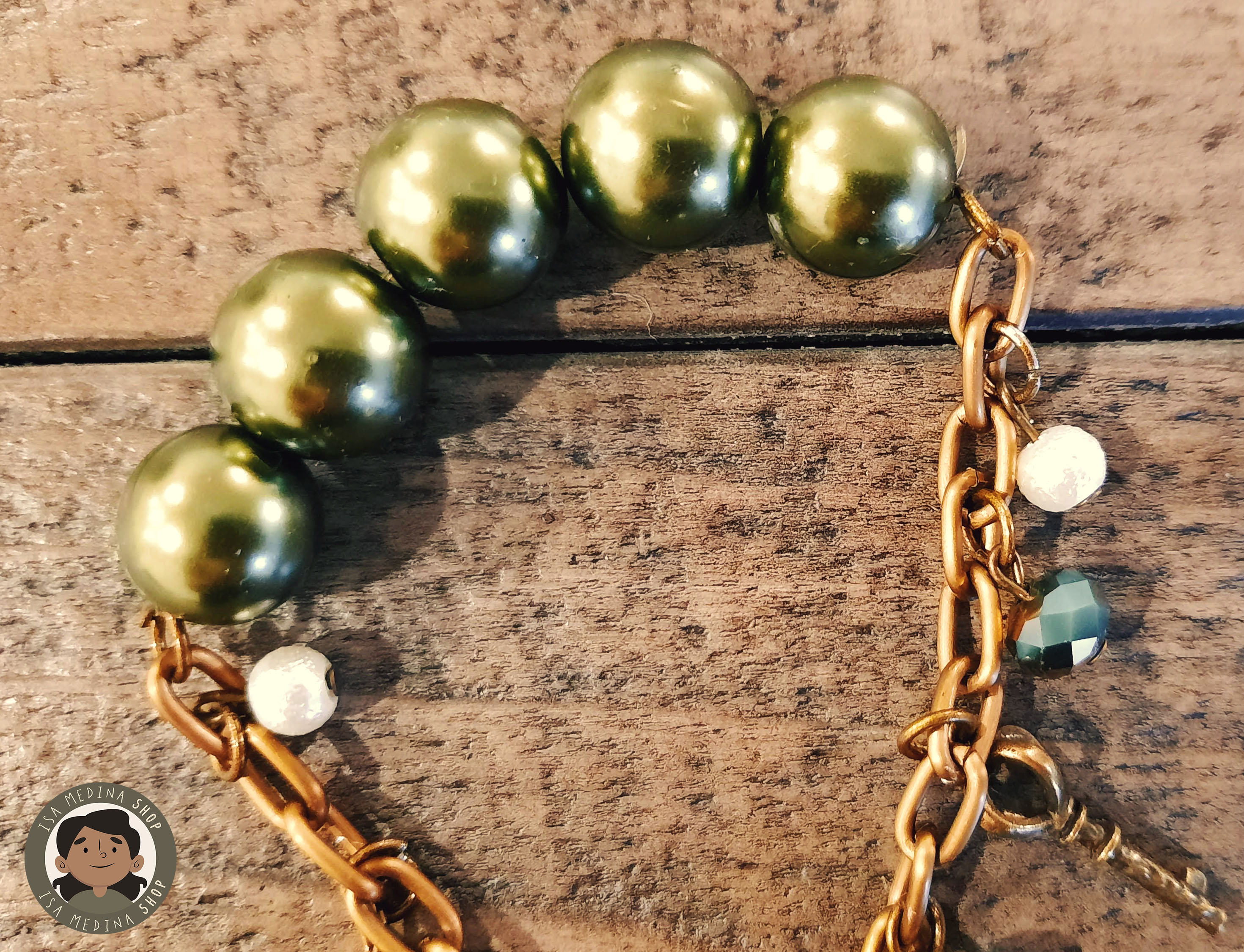 ¿Buscas un accesorio que tenga un toque vintage? ¡Esta pulsera es para ti!. Con perlas grandes en color verde y cristales facelados, de tonos verdes con bronce y además algunos dijes en tono bronce envejecido.