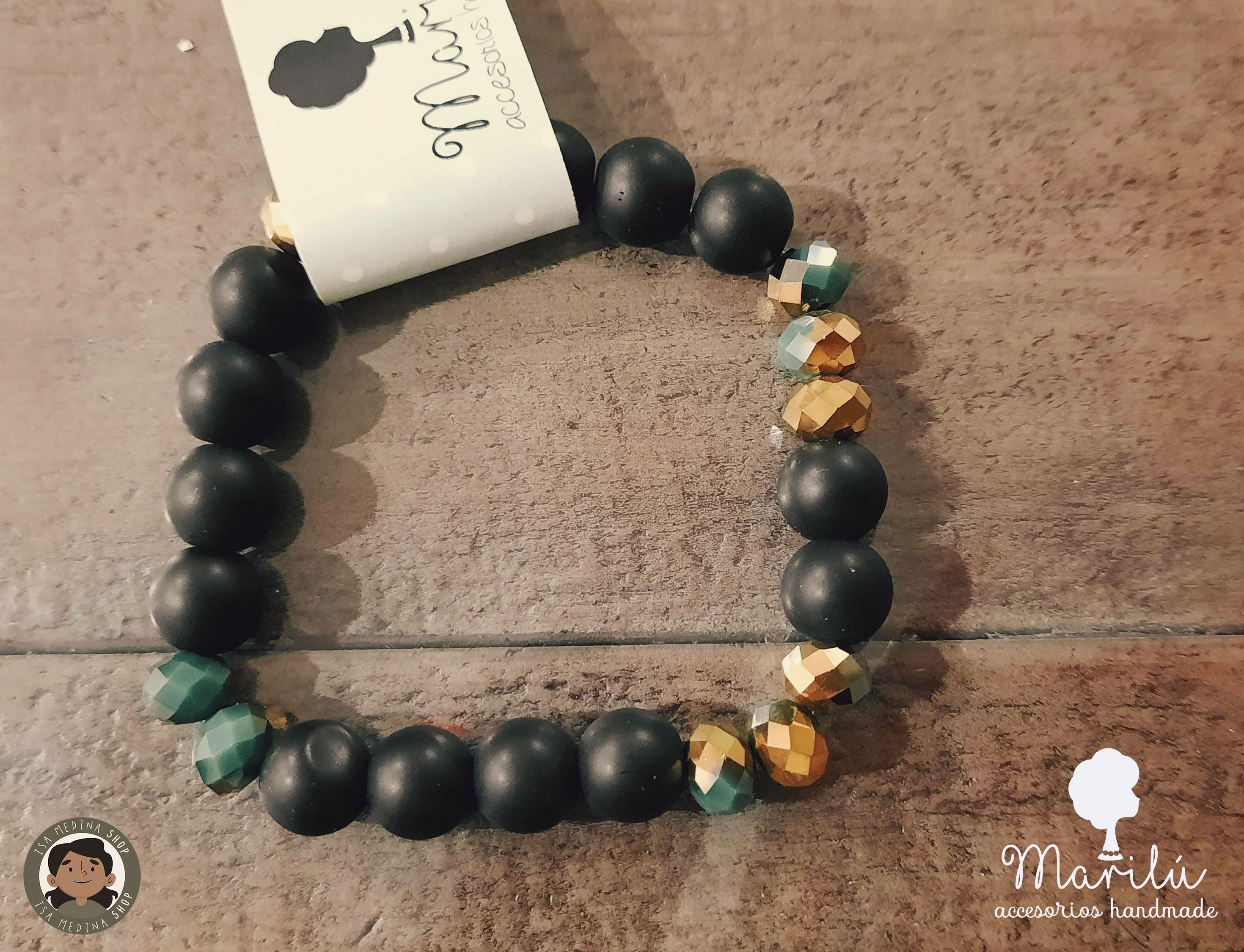 Una pulsera de la línea Marilú. Diseño con cuentas de ónix mate y cristales en tonos verde oscuro con reflejos dorados.